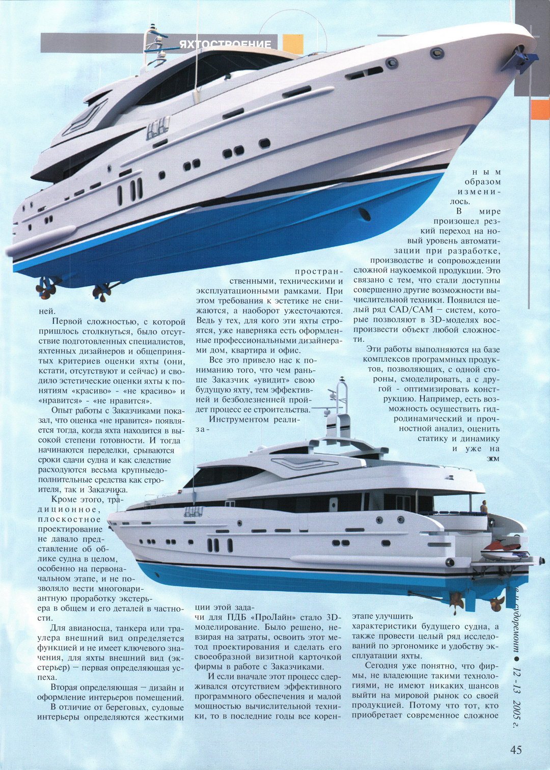 Если при проектировании корабля или судна функция является определяющей - она поддается анализу, обоснованию и оптимизации, то у яхты основным приоритетом является ее эстетическое восприятие. При этом основной принцип судостроения безопасность людей и яхты, как судна, - остается непререкаемым. Осознание этого различия привело нас к пониманию необходимости создания специализированной фирмы нового типа. Так в феврале 2003 года и возникло Проектно-дизайнерское бюро «ПроЛайн».