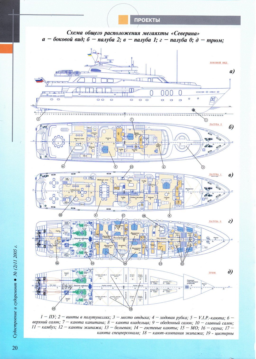 Обская губа — эти слова не встретишь в лексиконе яхтсменов мира. Наверное, поэтому проектировать и строить необычное судно должны были люди с нестандартным мышлением, незашоренные стереотипами. Судя по всему, расчет оказался правильным - «Северину» отличает сбалансированность, продуманность компоновки и оригинальный дизайн. Журнал «Судостроение и судоремонт» попросил проектантов мегаяхты рассказать об истории ее разработки и особенностях конструкции. ⠀⠀⠀⠀⠀Естественно, что особое внимание, правда, не в ущерб безопасности, уделялось формированию внутреннего пространства судна. Общая площадь кают составила 311 м². ⠀⠀⠀⠀⠀Сферы обитания моряков и пассажиров мегаяхты разделены, нет ни одной точки, где могут пересечься пути гостей и экипажа (за исключением стюардов). Это было достигнуто благодаря применению машинного отделения с безваxтенным обслуживанием. ⠀⠀⠀⠀⠀Для моряков имеются просторные каюты (общая площадь 88 м²) и уютная, оборудованная для отдыха кают-компания с местом для подогрева пищи. ⠀⠀⠀⠀⠀Что касается пассажиров, то в их распоряжении четыре примерно одинаковых каюты, вместе занимающих 106 м² и апартаменты класса люкс — каюты владельца и V.l.Р. гостя практически равные по площади — 77 и 72 м² соответственно. Они включают в себя спальню, гостиную, кабинет, гардеробную и санузел оборудованный ванной и душевой кабиной с разделением на «Ее» и «Его» зоны. ⠀⠀⠀⠀⠀Для пассажиров предусмотрены три салона общей площадью более 140 м², открытая палуба с обеденным столом, купальная площадка с выходом из сауны, продолжение главного салона - палуба для отдыха со столиками и диваном, солнечная ба площадью более 100 м², оборудованная баром и «джакузи». ⠀⠀⠀⠀⠀Отделка помещений выполняется с применением массива ценных пород дерева. Подволок зашивается металлопластовыми панелями. Помещения экипажа и спецперсонала отделываются панелями «TNF». ⠀⠀⠀⠀⠀Открытые участки палуб покрываются тиком по технологии «Sikaflex». ⠀⠀⠀⠀⠀Система кондиционирования воздуха предназначена для создания комфортной температуры и влажности в обслуживаемых помещениях: каютах, салонах, ходовой рубке, столовой и кают- компании экипажа. Она поддерживает температуру воздуха в перечисленных помещениях в летнее время +20°С при температуре наружного воздуха +30 °С и в зимнее время +22°С при температуре наружного воздуха -15 °С. ⠀⠀⠀⠀⠀На судне установлено спутниковое телевидение и специальная охранная система, на монитор которой выводится изображение со всех видеокамер, расположенных в разных частях открытой палубы и в машинном отделении, а также противовзломная сигнализация. ⠀⠀⠀⠀⠀«Северина» спроектирована и строится по Правилам и под наблюдением Российского морского регистра судоходства на класс КМ ★ ЛУ1 II СП. Остойчивость судна при всех эксплуатационных случаях загрузки удовлетворяет действующим Правилам Регистра для судов II ограниченного района плавания. ⠀⠀⠀⠀⠀По архитектурно-конструктивному типу «Северина» - двухвинтовое, двухпалубное судно, с развитой двухъярусной надстройкой, полубаком и промежуточным расположением машинного отделения. Кормовая часть корпуса выполнена с двумя полутунеллями, чтобы обеспечить размещение винтов при небольшой осадке. Пять поперечных водонепроницаемых переборок делят корпус судна на шесть водонепро