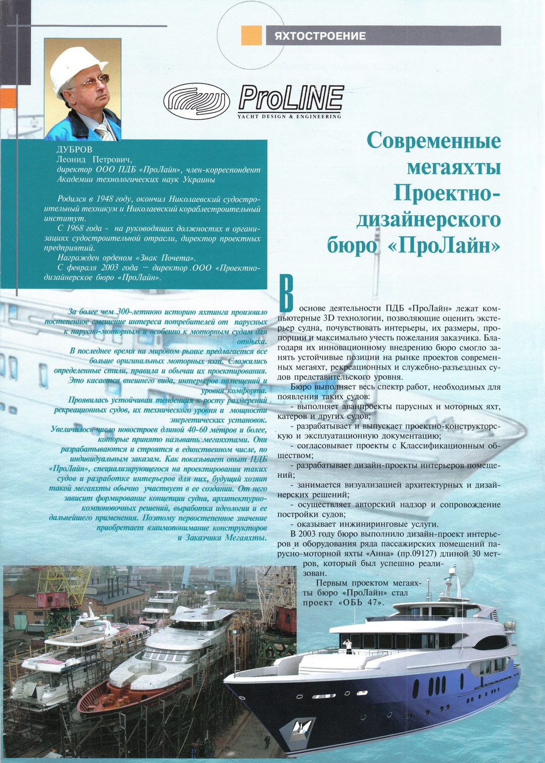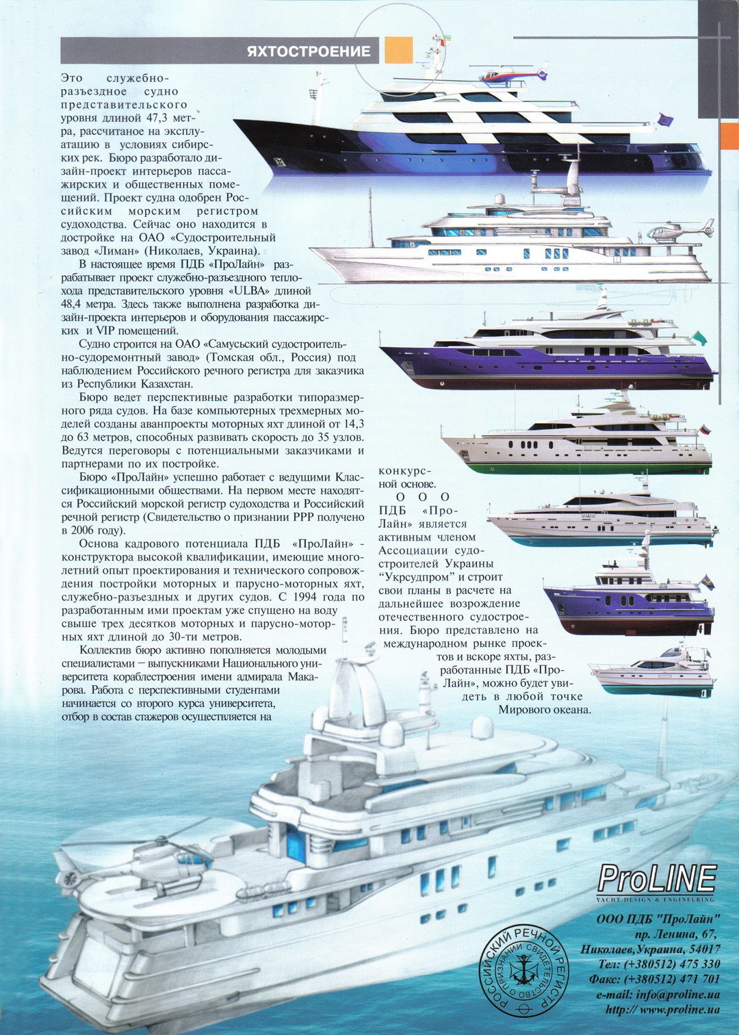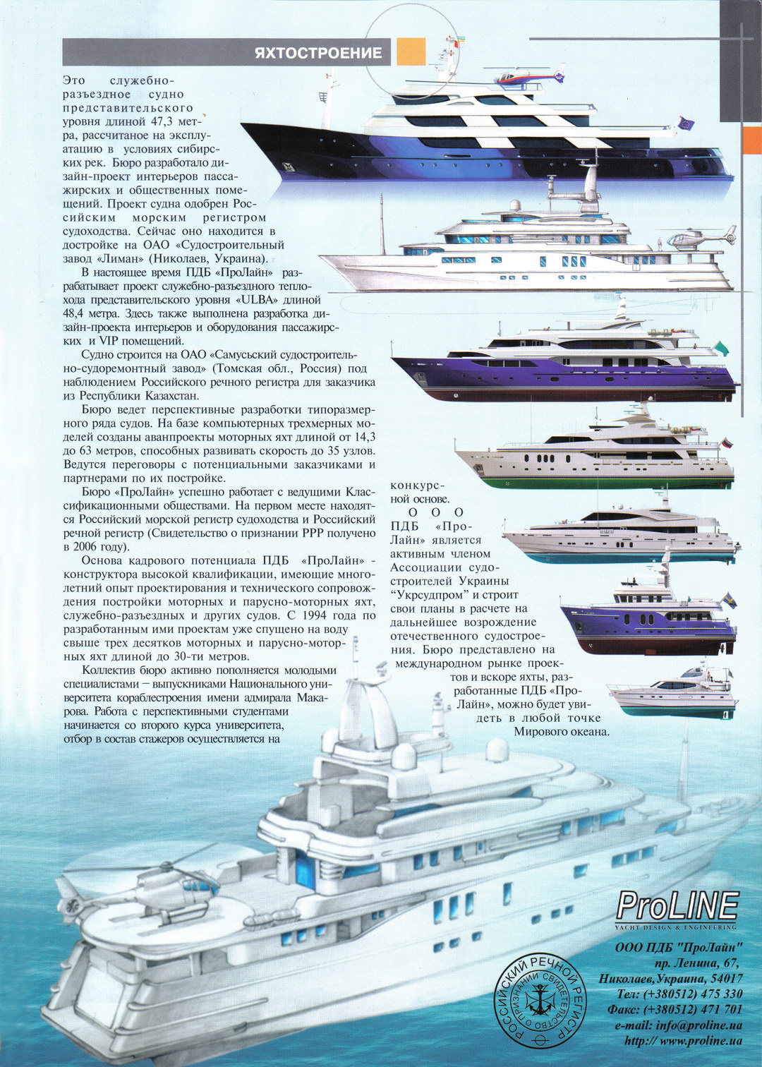 Увеличилось число новостроев длиной 40-60 метров и более, которые принято называть мегаяхтами. Они разрабатываются и строятся в единственном числе, по индивидуальным заказам. Как показывает опыт ПДБ «ПроЛайн», специализирующегося на проектировании таких судов и разработке интерьеров для них, будущий хозяин такой мегаяхты обычно участвует в ее создании. От него зависит формирование концепции судна, архитектурно-компоновочных решений, выработка идеологии и ее дальнейшего применения. Поэтому первостепенное значение приобретает взаимопонимание конструкторов и Заказчика Мегаяхты.