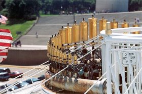 An interesting feature of such vessels is the calliope steam device - calliope with a piercing sound heard over kilometers. Calliope consists of a horizontal pipe - a steam manifold and whistles tuned to different notes. Big whistles - low notes, small whistles - high notes. Traditionally, the whistles are inscribed in a common exterior.