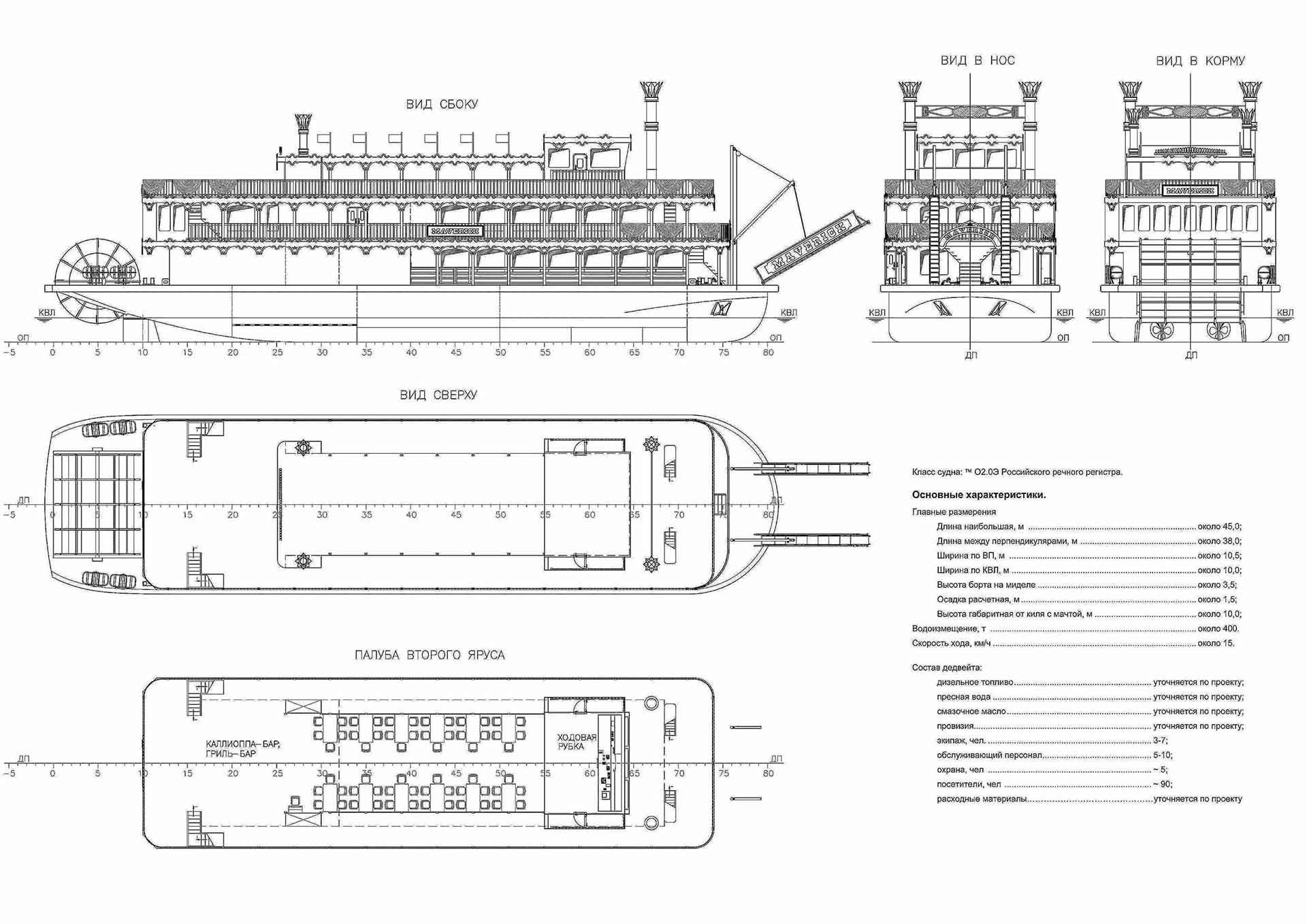 The project of the floating entertainment center is a vessel with the capability of execution in rack-mount or self-propelled versions, stylized as American river steamers of the middle and second half of the XIX century, operated on the Mississippi, Missouri and Ohio rivers.