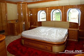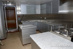 The concept of separation of passengers and crew is implemented on the yacht. In everyday life, they do not overlap. The crew is located in four double cabins with separate bathrooms, he has his separate mess room both with a place for rest and a place for heating food. There is a block cabin near the wheelhouse for the captain.