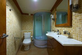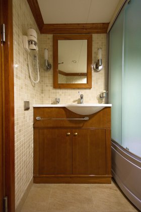 The salon of the apartments is connected with a spacious balcony via a glassy sliding door. There are five block cabins of passengers and special personnel cabins, with separate sanitary units for each room.