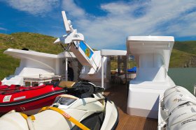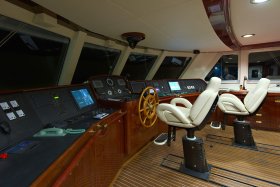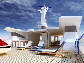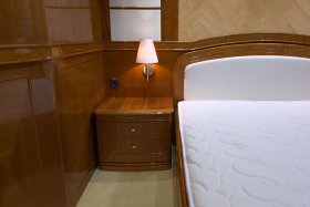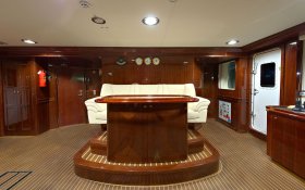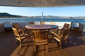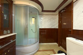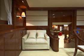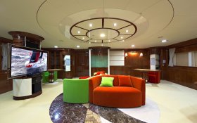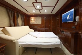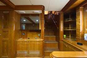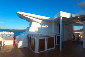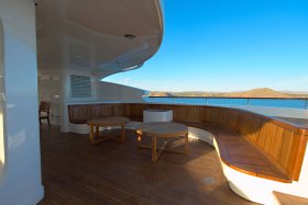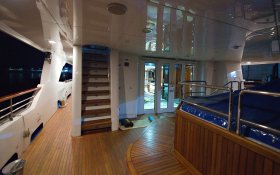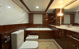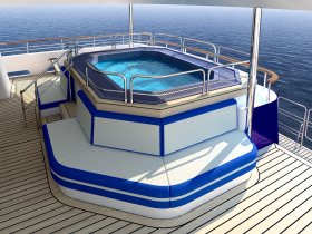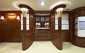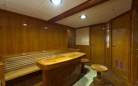 On the sundeck, under the rigid stationary awning, the opened company cabin is equipped with a spa pool, a stationary grill, seating areas and sunbathing areas. One more pool is installed on the upper deck for passengers who love to swim after the sauna. The prestige of the vessel emphasizes deck mechanisms and equipment from polished stainless steel of the highest quality and reliability delivered from the world's best manufacturers.
