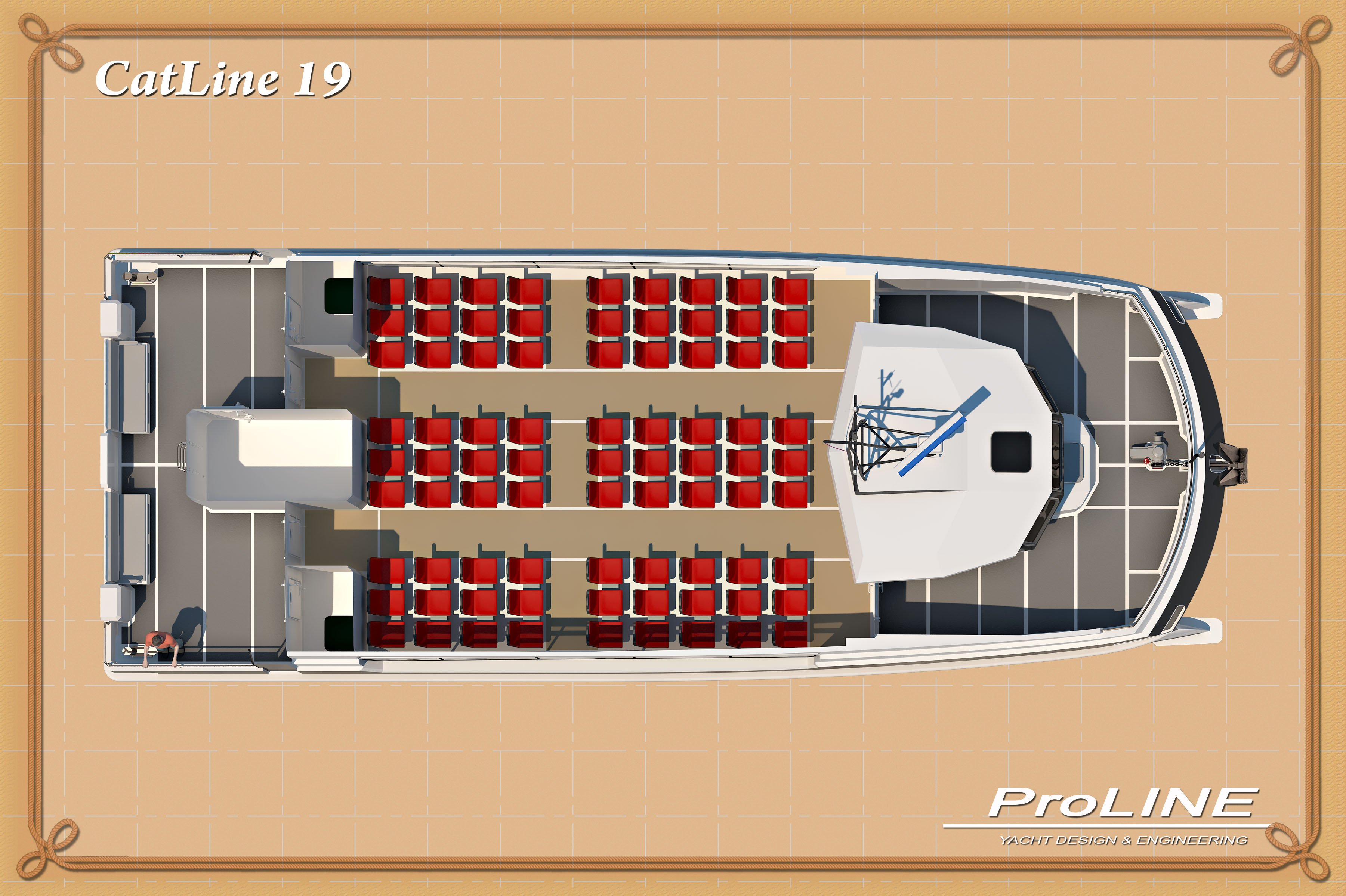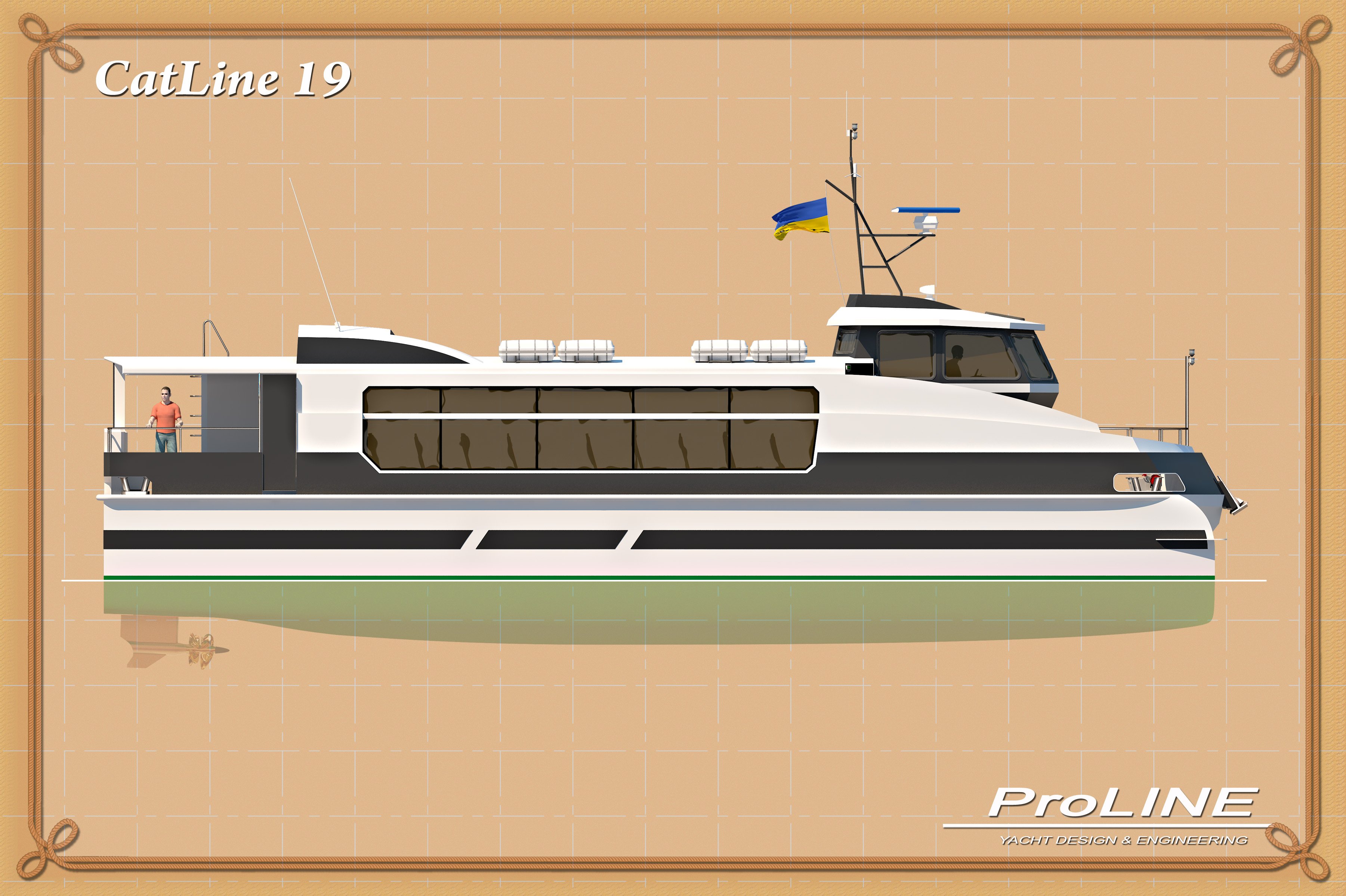 CatLine19 is a one-deck catamaran with an aluminum hull and a superstructure. Superstructure - the entire width of the hull. The wheelhouse is forward to provide a better visibility.