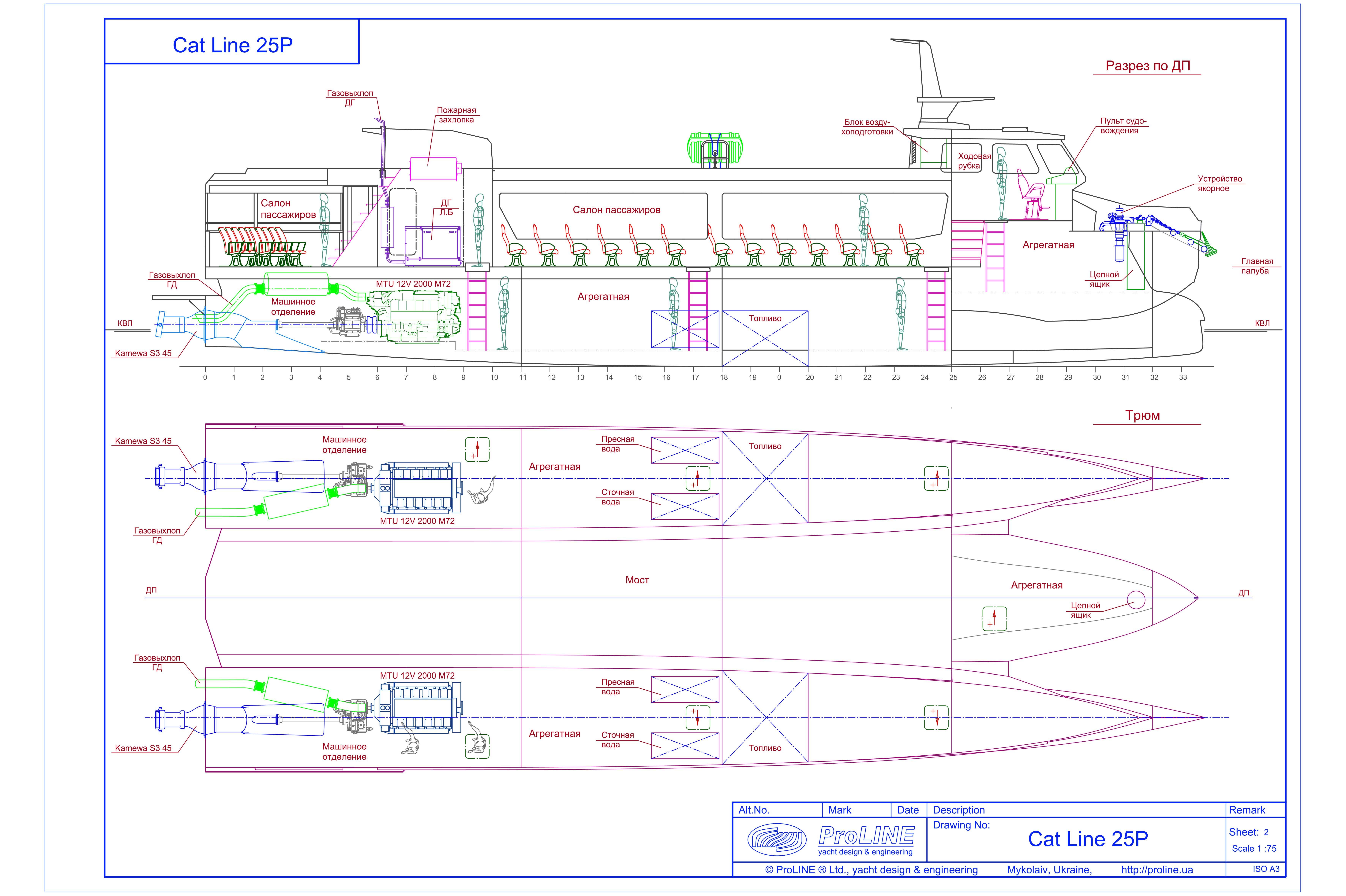 The main engines and propulsion systems are located in the hulls, diesel generators - on the main deck.