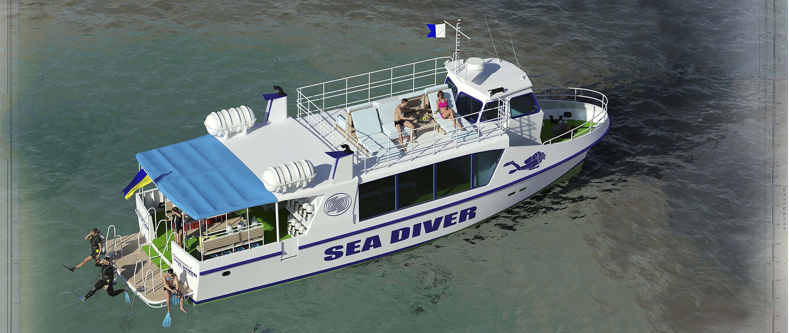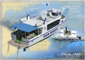 The main purpose of the vessel is to conduct day diving tours during daylight hours. Depending on the conditions on the dive sites, it is possible to conduct both one dive during the tour, and several. In the presented configuration, the vessel can provide up to six dives of twelve people to depths not exceeding twelve meters. At great depths, the number of dives is determined by the necessary pauses between dives and depends on the depths. To ensure immersions, the presented equipment provides installation sites for 12-liter high-pressure cylinders with a working pressure of 225 kg/cm² and a high-pressure compressor with a capacity of 450 l/min with electric drive. Electric power to power the compressor and other needs is produced by a 30 kW diesel generator.