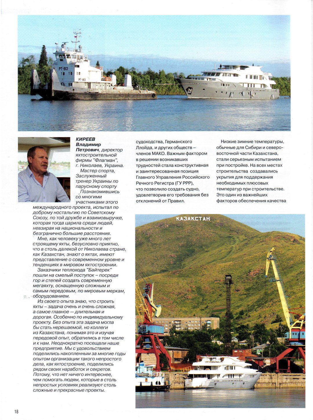 ⠀⠀⠀⠀⠀Строительство судна в России для заказчика из Казахстана с применением оборудования, произведенного по всему миру от Швеции и Германии до Южной Кореи и Австралии, потребовало координации действий классификационных органов - Российского Речного Регистра, Российского Морского Регистра судоходства, Германского Ллойда, и других обществ - членов МАКО. Важным фактором в решении возникавших трудностей стала конструктивная и заинтересованная позиция Главного Управления Российского Речного Регистра (ГУ РРР), что позволило создать судно, удовлетворив его требования без отклонений от Правил.