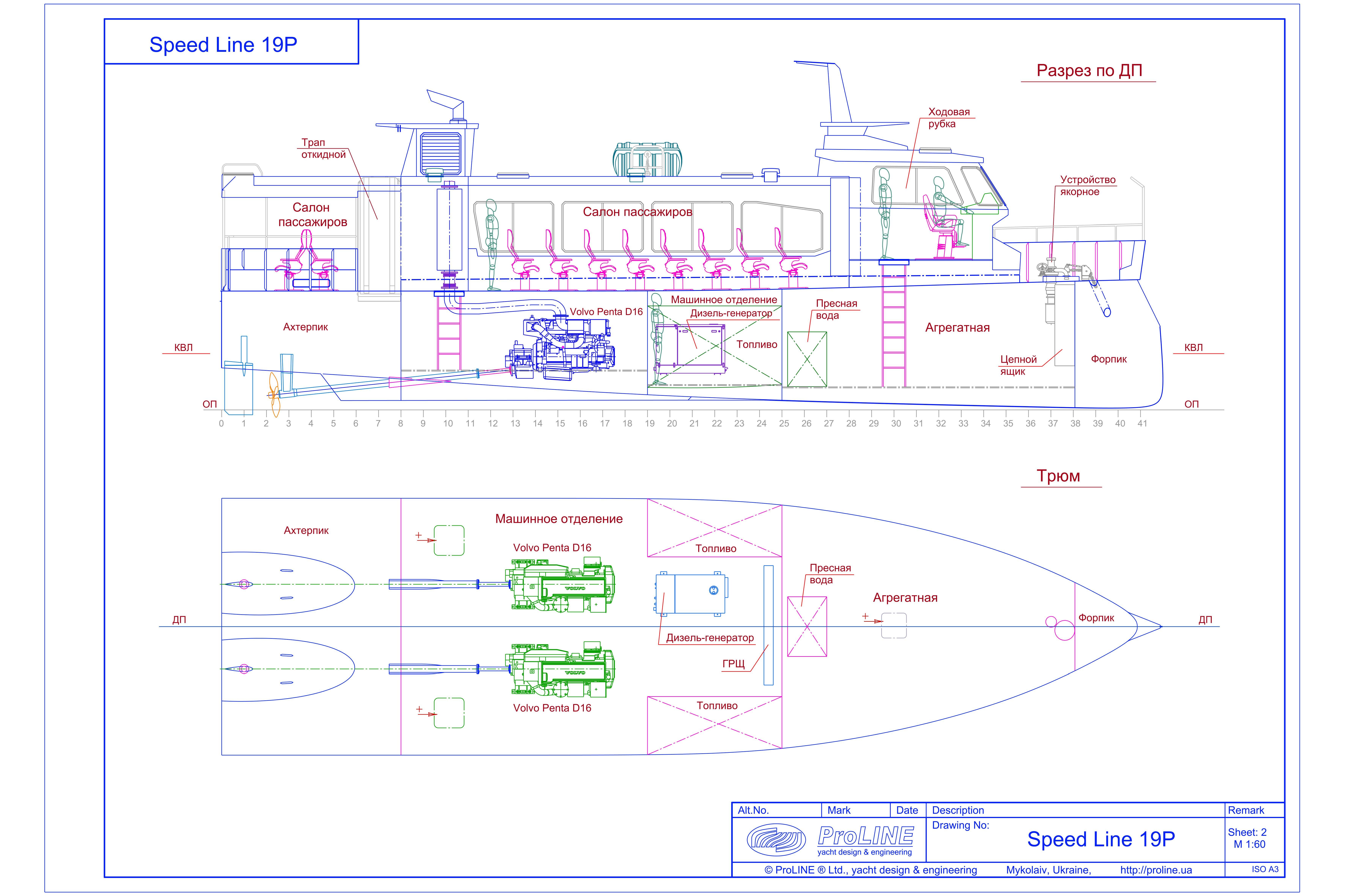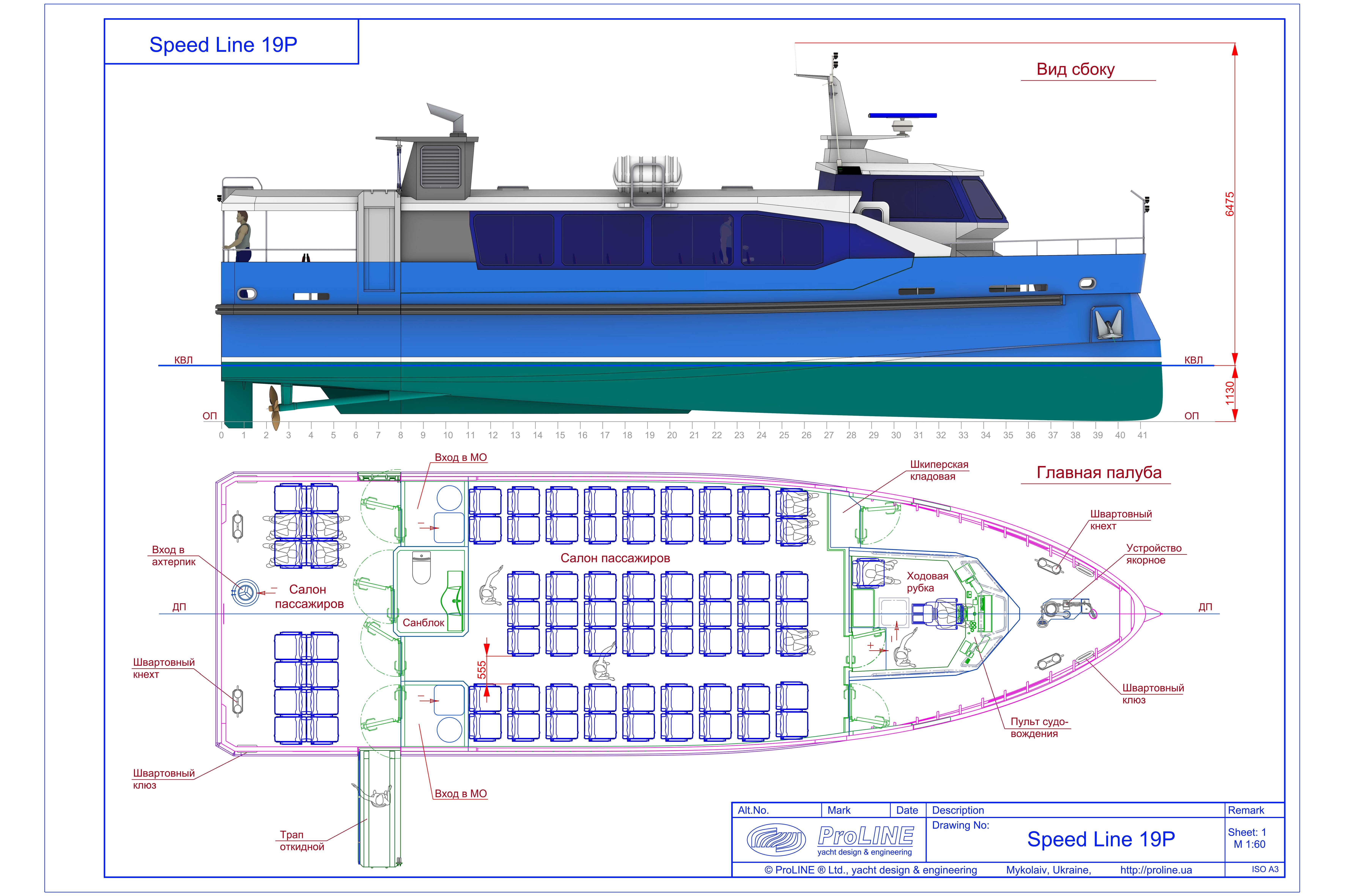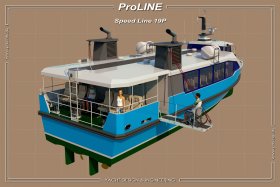 SpeedLine 19P – стальное однокорпусное судно с надстройкой из алюминиевого сплава. Ходовая рубка вынесена вперёд для обеспечения лучшего обзора. Салон для перевозки пассажиров находится на верхней (главной) палубе. Машинное отделение расположено в кормовой части корпуса и отделено водонепроницаемыми переборками. Необходимые цистерны топлива, пресной воды и стоков смонтированы в средней части корпуса и являются вкладными.